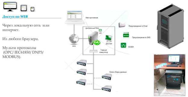 Блок сбора данных, на который поступает сигнал с нескольких датчиков. По сети связи данные передаются на верхний уровень - в центральный блок сервера АРМ, который располагается в ОПУ/диспетчерской.